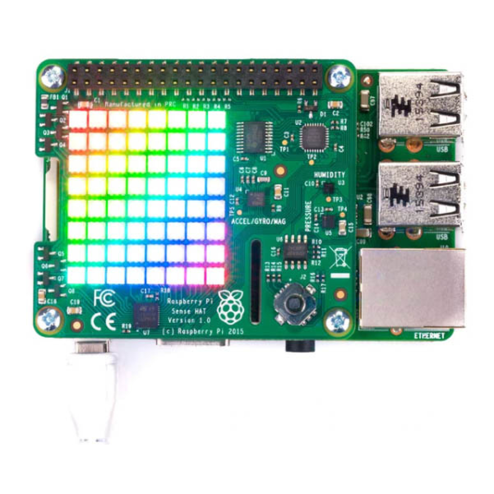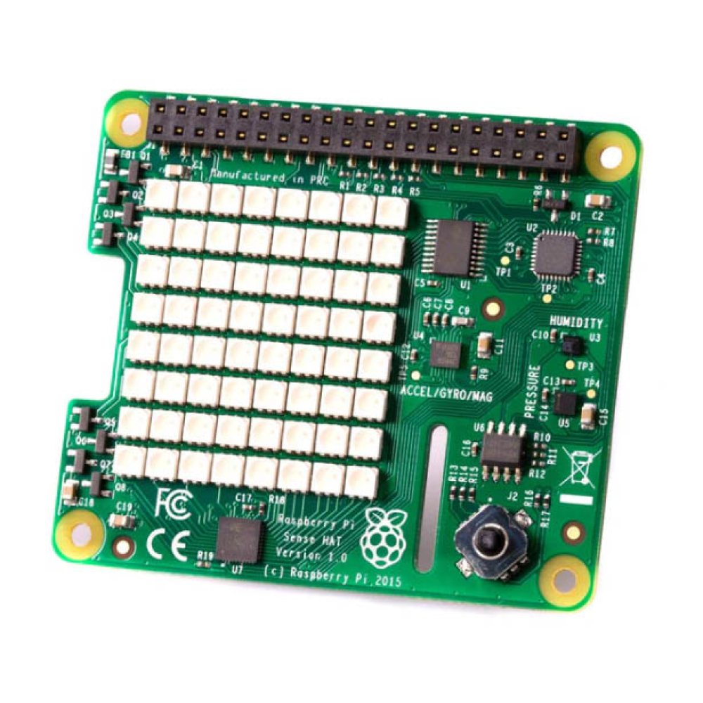 De Sense HAT heeft een 8×8 RGB LED matrix, een vijf-knops joystick en bevat de volgende sensoren: